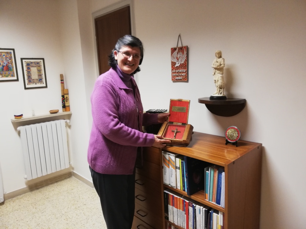 A nossa Superiora Geral, Graciela Francovig, já está conhecendo os novos espaços de trabalho. Na foto, Graciela com o crucifixo que Madre Cândida sempre carregava e deu a benção.