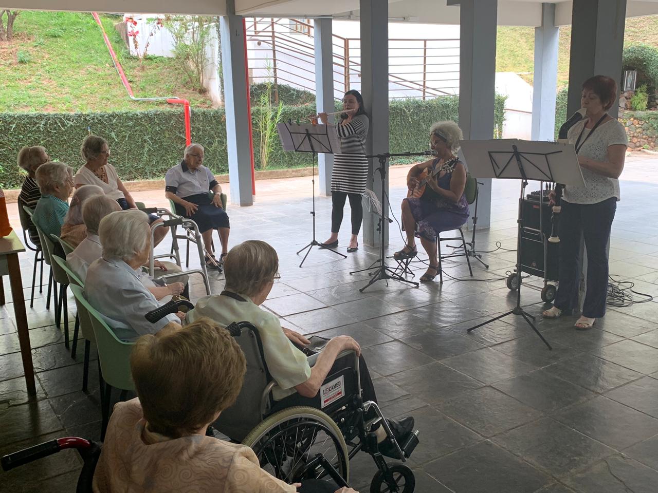 Dando continuidade à programação especial em comemoração ao Dia Internacional do Idoso, no dia 23 de outubro, as irmãs da Casa de Nazaré receberam a Cecília, sobrinha das irmãs Rita e Silvéria Machado, com o seu grupo musical composto por flauta e violão. Foi um dia encantador com canções que relembraram a trajetória de vida das irmãs.