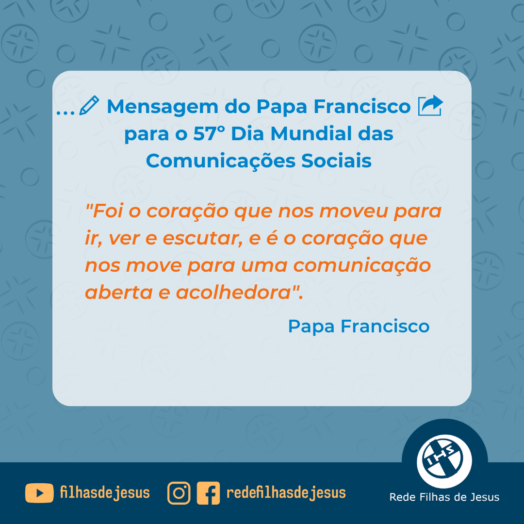 Hoje foi divulgada a mensagem do Papa Francisco para o 57º Dia Mundial das Comunicações Sociais, que será celebrado no próximo dia 21 de maio sobre o tema “Falar com o coração. Testemunhando a verdade no amor”.