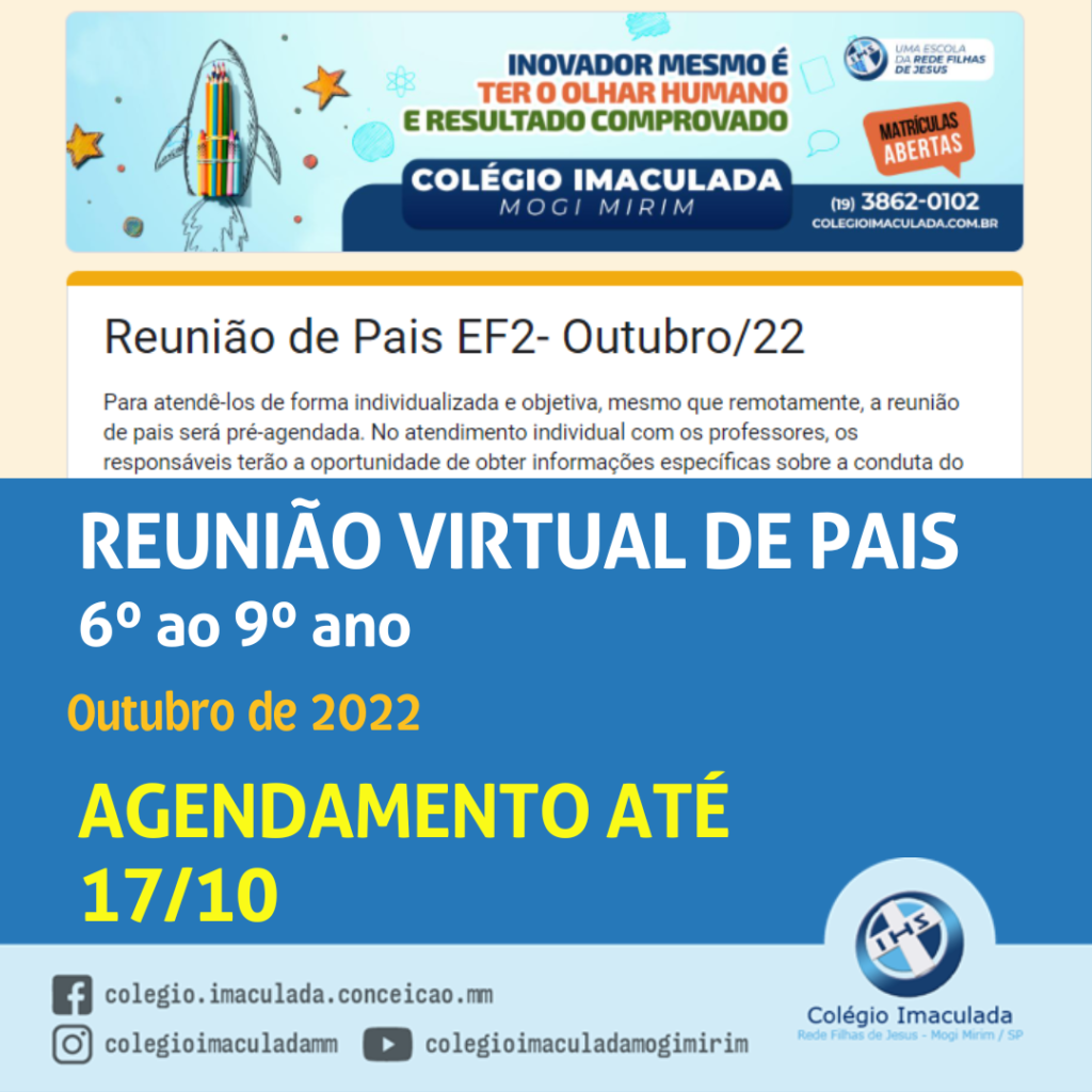 Reunião de Pais – 6º ao 9º ano Agendamento: 13 a 17/10/2 Carregando… O post IEIC – Reunião de Pais EF2 (Outubro/22) apareceu primeiro em Colégio Imaculada – Mogi Mirim.