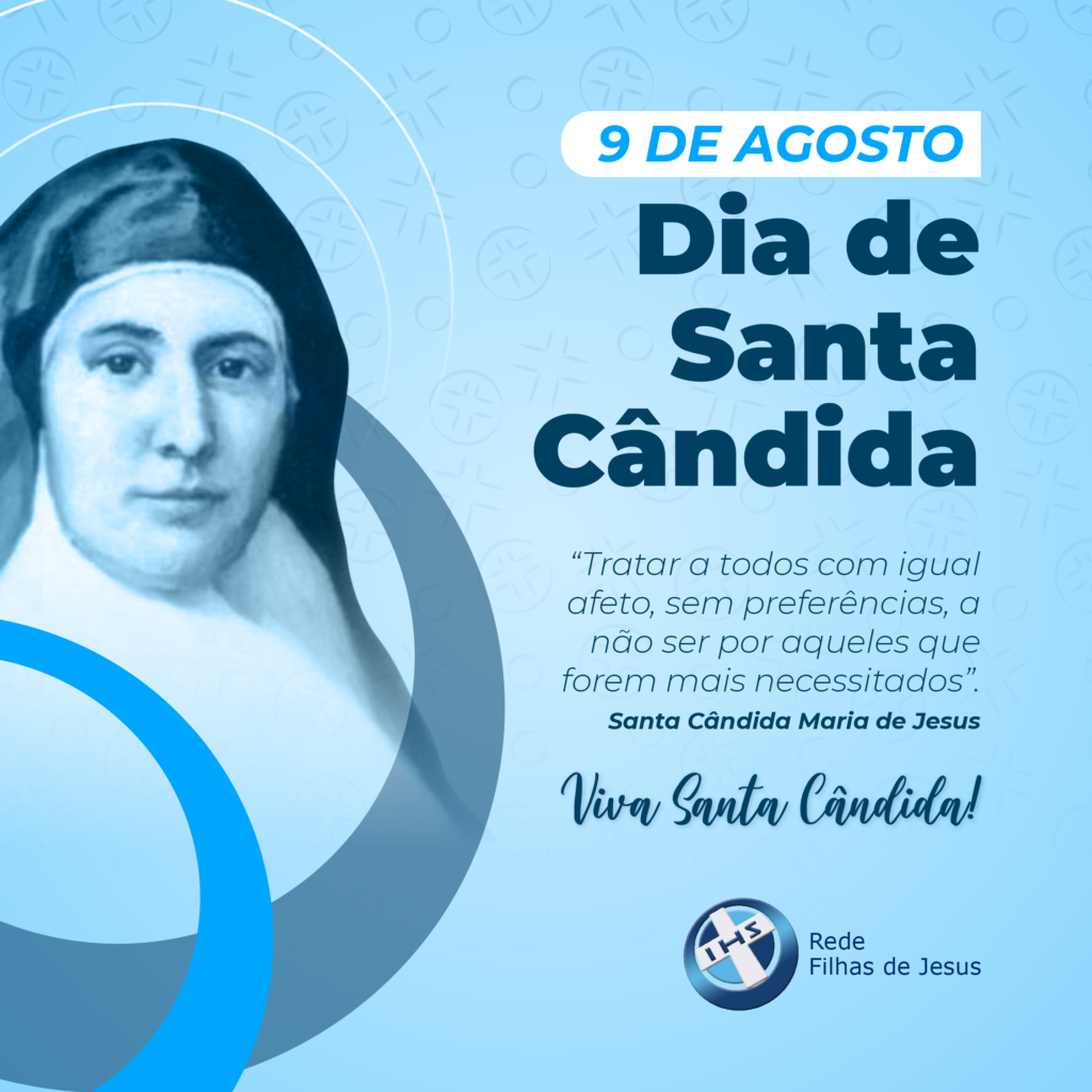 No dia 9 de agosto, toda a família da Congregação das Filhas de Jesus celebra com muita alegria o dia de Santa Cândida, nossa fundadora. Nesta data especial, relembramos a sua simplicidade, coragem e constante entrega à vontade de Deus. Sua missão teve como profunda motivação: buscar a Glória de Deus e promover o bem […]